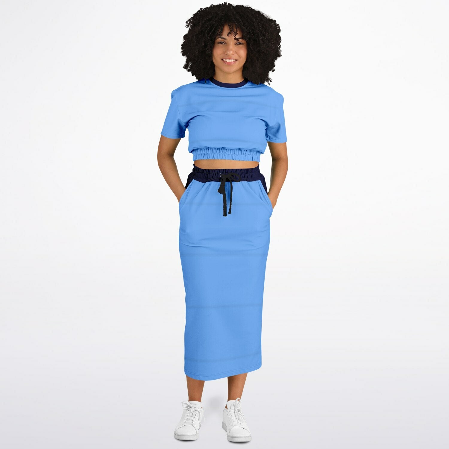 This fashion cropped short sleeve sweatshirt and long pocket skirt set is the perfect combination of comfort and style. Dress it up with heels for weekend brunch or you can also style it with white sneakers for a casual mall trip. It’s so versatile, you can wear it anywhere!