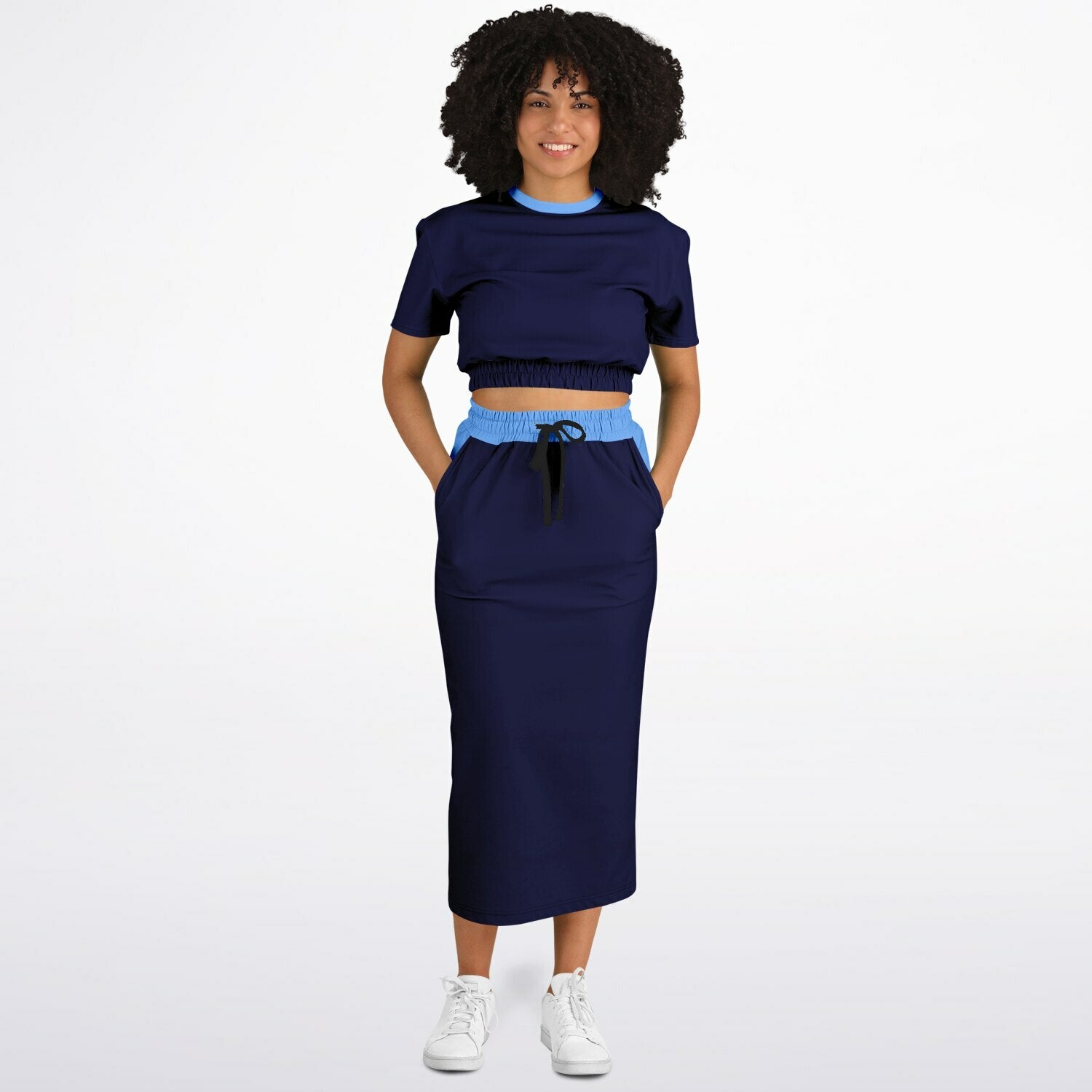 This fashion cropped short sleeve sweatshirt and long pocket skirt set is the perfect combination of comfort and style. Dress it up with heels for weekend brunch or you can also style it with white sneakers for a casual mall trip. It’s so versatile, you can wear it anywhere!