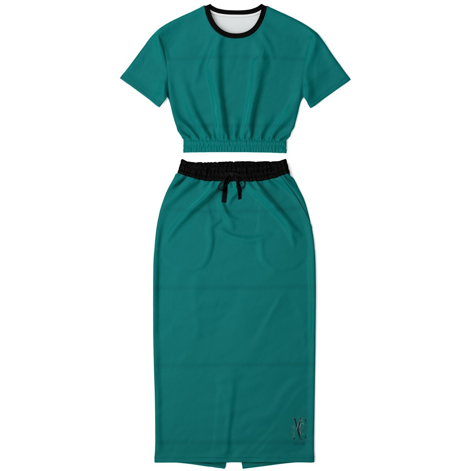 Teal Fashion Cropped Short Sleeve Sweatshirt and Long Pocket Skirt Set